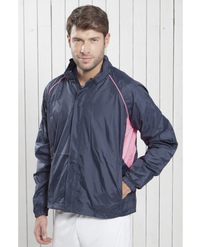 Windschutz. Ganzer Reißverschluss mit dekorativem kontrastierendem Besatz, seitlichen Taschen, anpassbaren Manschetten und Kapuze mit Haken und Ösen.