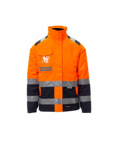 Zweifarbige, gut sichtbare Damenjacke mit 3M-Streifen, Kunststoffreißverschluss mit Metallzug mit Klappe und Klettverschluss, ausklappbarer Kapuze, elastisch verstellbaren Manschetten, zwei verdeckten Vordertaschen, einer Brusttasche mit Ausweishalter. Gepolstert, Fleece-Innenkragen, Innentasche, heißgeklebte Nähte