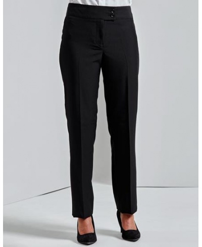 Eine Hose mit geradem Bein für Damen, die über einen tiefen Bund mit überkreuzter Lasche und einen Verschluss mit zwei Knöpfen verfügt. Diese Hose ist in zwei Beinlängen erhältlich und eignet sich hervorragend als Allround-Uniformhose.