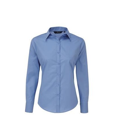 Eine stilvolle Damenbluse mit langen Ärmeln, die in 27 Farben erhältlich ist. Diese Bluse bietet der Trägerin einen halb taillierten, femininen Stil mit weichem Kragen, Brust, Abnähern auf der Rückseite und einem abgerundeten unteren Saum.