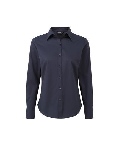Eine stilvolle Damenbluse mit langen Ärmeln, die in 27 Farben erhältlich ist. Diese Bluse bietet der Trägerin einen halb taillierten, femininen Stil mit weichem Kragen, Brust, Abnähern auf der Rückseite und einem abgerundeten unteren Saum.
