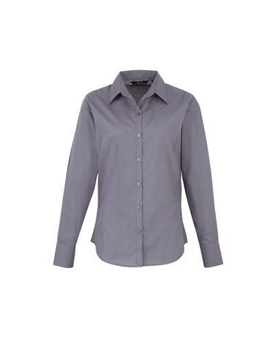 Eine stilvolle Damenbluse mit langen Ärmeln, die in 27 Farben erhältlich ist. Diese Bluse bietet der Trägerin einen halb taillierten, femininen Stil mit weichem Kragen, Brust, Abnähern auf der Rückseite und einem abgerundeten unteren Saum.