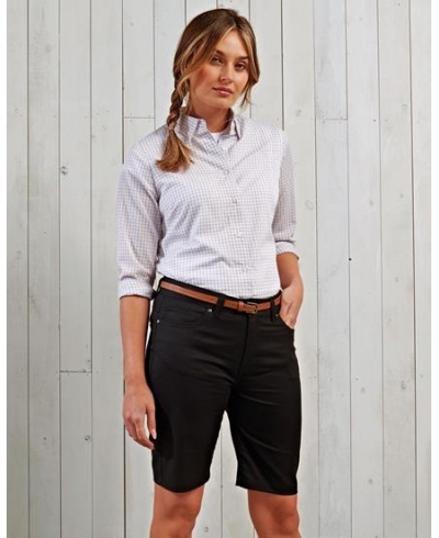 Diese Chino-Shorts für Damen basieren auf unseren beliebten Chino-Jeans und verfügen über einen verdeckten Reißverschluss und einen Knopf am Bund. Am Bund befinden sich Schlaufen zum Anbringen eines Gürtels, zwei Seitentaschen mit Nietendetails und zwei aufgesetzte Taschen auf der Rückseite. Diese Chino-Shorts mit doppelt umgeschlagenem Saum sind eine tolle Option für die wärmeren Monate und bieten einen lässigeren und verspielteren Ansatz für die Unternehmenskleidung. Ein Hauch von Elasthan im Stoff sorgt für ein gewisses Maß an Dehnbarkeit für maximalen Komfort.