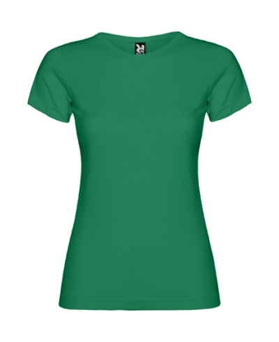 Tailliertes Damen T-Shirt. 1x1 gerippter Rundhalskragen, doppellagig. Nackenband, Seitennähte.