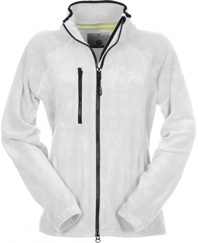 Taillierte Damen-Fleecejacke mit durchgehendem, schwarzem 8 mm Reißverschluss aus Kunststoff, Raglanärmeln, regulierbarem Kordelzug in der Taille, elastischen Ärmelbündchen, zwei Taschen mit verdecktem Reißverschluss, einer Vordertasche mit Reißverschluss, Kragen mit verstärktem Rand in Kontrastfarbe, verstärkten Nähten