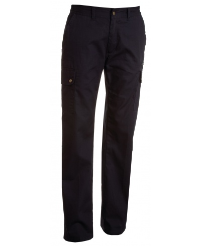 Ganzjährig tragbare Damenhose im klassischen Schnitt mit seitlich dehnbarem Bund und Gürtelschlaufen, Hosenschlitz mit Metallreißverschluss und -knopf, zwei klassisch geschnittenen Vordertaschen, zwei Seitentaschen mit Patte und Druckknöpfen, einer Reißverschlusstasche links, einer Einstecktasche für den Zollstock rechts, zwei Gesäß-Leistentaschen mit Knopf und Knopfloch