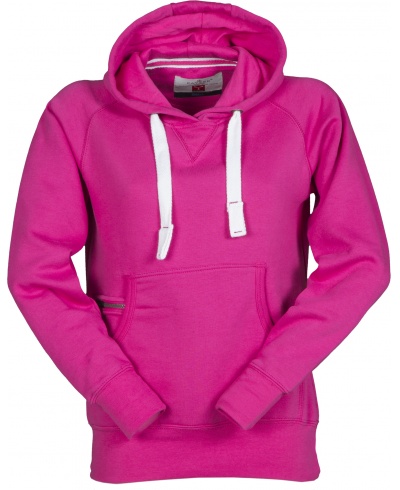Tailliertes Damen-Sweatshirt mit Kapuze mit zwei Nähten und weißem Kordelzug, Nähten Ton-in-Ton und Metallösen, Raglanärmeln, V-Ziernaht am Ausschnitt, Kängurutaschen, Reißverschlusstäschchen,