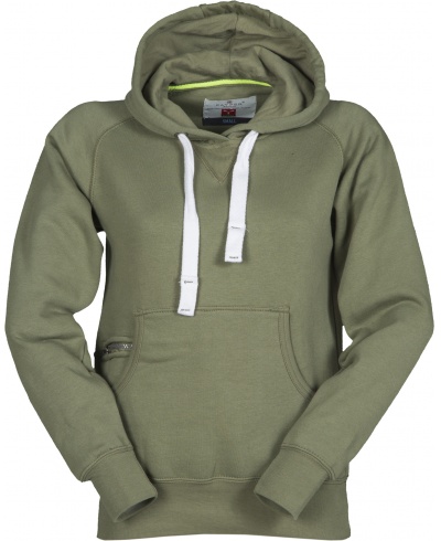 Tailliertes Damen-Sweatshirt mit Kapuze mit zwei Nähten und weißem Kordelzug, Nähten Ton-in-Ton und Metallösen, Raglanärmeln, V-Ziernaht am Ausschnitt, Kängurutaschen, Reißverschlusstäschchen,
