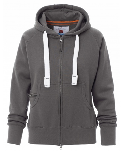 Taillierte Damen-Sweatjacke mit durchgehendem, verdecktem 2-Wege-SBS-Reißverschluss aus Kunststoff mit Metallschieber, Kapuze mit zwei Nähten und weißem Kordelzug, Nähten Ton-in-Ton und Metallösen, Raglanärmeln, Kängurutaschen mit Reißverschlusstäschchen, elastischem Feinripp an Ärmeln und Taille, verstärkten Nähten