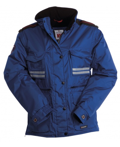 Kragen einrollbarer Kapuze, regulierbaren Ärmelbündchen, grauen Reflexstreifen vorne und hinten, vorgeformten Ellbogen und Seitenschlitz mit Ziehharmonikafalte und Reißverschluss, neun Außentaschen, davon zwei mit LOCK SYSTEM, zwei mit Reißverschluss und verstärkter Innenseite, einer mit nach innen wendbarem Ausweisfach; Innenseite: wattiert, Kragen, Rücken- und Nierenschutz aus Mikrofleece, atmungsaktive Einsätze, Kordelzug in der Taille und Innenreißverschluss zum einfacheren Veredeln mit Druck und