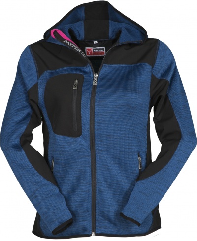 Taillierte Damen-Jacke mit langem versiegeltem SBS-Reißverschluss, vorgeformter Kapuze mit zwei Nähten, feinem Saum an Handgelenk und Taille, zwei Seitentaschen mit Reißverschluss, einer Brusttasche und schwarzen Strick- und Softshell-Einsätzen