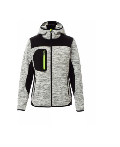 Taillierte Damen-Jacke mit langem versiegeltem SBS-Reißverschluss, vorgeformter Kapuze mit zwei Nähten, feinem Saum an Handgelenk und Taille, zwei Seitentaschen mit Reißverschluss, einer Brusttasche und schwarzen Strick- und Softshell-Einsätzen