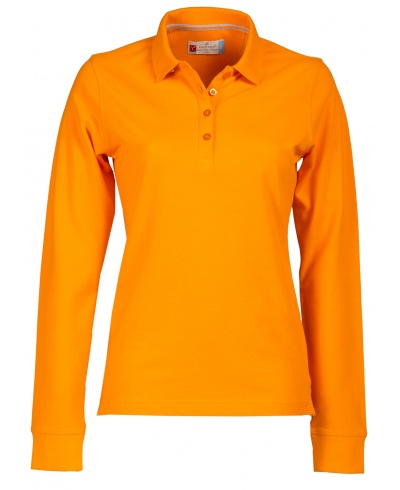 Tailliertes Damen-Polo-Shirt, langärmelig, mit 4 Knöpfen Ton-in-Ton mit Perlmutteffekt, Kragen und Ärmelrand aus Feinripp, Seitenschlitzen, Nackenband in Kontrastfarbe, Stretchnähten, seitlichem Verstärkungsband, Nackensattel