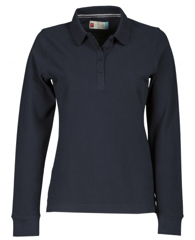Tailliertes Damen-Polo-Shirt, langärmelig, mit 4 Knöpfen Ton-in-Ton mit Perlmutteffekt, Kragen und Ärmelrand aus Feinripp, Seitenschlitzen, Nackenband in Kontrastfarbe, Stretchnähten, seitlichem Verstärkungsband, Nackensattel