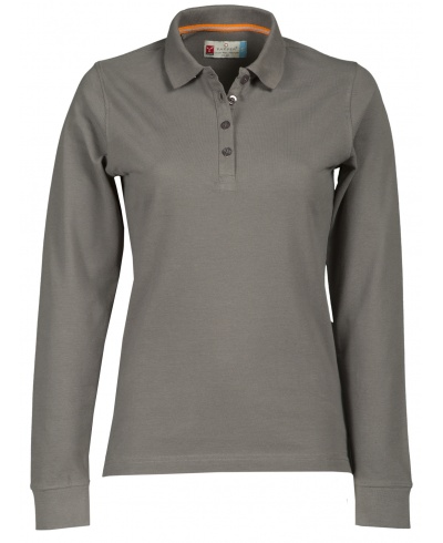 Tailliertes Damen-Polo-Shirt, langärmelig, mit 4 Knöpfen Ton-in-Ton mit Perlmutteffekt, Kragen und Ärmelrand aus Feinripp, Seitenschlitzen, Nackenband in Kontrastfarbe, Stretchnähten, seitlichem Verstärkungsband, Nackensattel