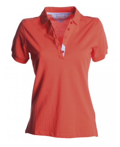 Tailliertes Damen-Polo-Shirt, kurzärmelig, mit 5 Knöpfen Ton-in-Ton mit Perlmutteffekt, Kragen und Ärmelrand aus Feinripp, dezenten, hellblauen Popeline-Einsätzen an der Krageninnenseite, Knopfleiste und an den Seitenschlitzen, Transfer-Etikett, Nackensattel