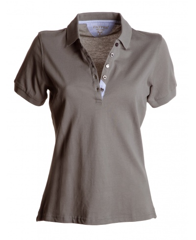 Tailliertes Damen-Polo-Shirt, kurzärmelig, mit 5 Knöpfen Ton-in-Ton mit Perlmutteffekt, Kragen und Ärmelrand aus Feinripp, dezenten, hellblauen Popeline-Einsätzen an der Krageninnenseite, Knopfleiste und an den Seitenschlitzen, Transfer-Etikett, Nackensattel