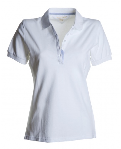 Tailliertes Damen-Polo-Shirt, kurzärmelig, mit 5 Knöpfen Ton-in-Ton mit Perlmutteffekt, Kragen und Ärmelrand aus Feinripp, dezenten, hellblauen Popeline-Einsätzen an der Krageninnenseite, Knopfleiste und an den Seitenschlitzen, Transfer-Etikett, Nackensattel