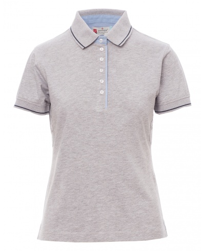 Tailliertes Damen-Polo-Shirt, kurzärmelig, mit sechs weißen Knöpfen, Innenseite des Kragens, der