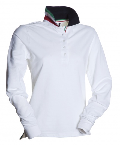 Langärmliges Damen Poloshirt mit 5 passenden Perlmutt-Effektknöpfen, passendem Kragen, mit kontrastierender Unterseite (Farben der Flagge). Innere Knopfleiste und Seitenschlitze mit Farben der Flagge, Rippkragen und Manschetten, verdeckte Kragennähte, Seitenverstärkungsband