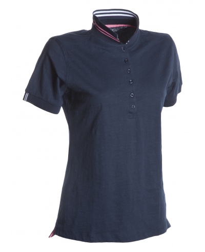 Tailliertes Damen-Polo-Shirt, kurzärmelig, mit 6 Knöpfen Ton-in-Ton und Perlmutteffekt, Oberseite des Kragens mit Kontraststreifen und Unterseite mit Leuchtstreifen, die nur bei aufgestelltem Kragen sichtbar sind, mit Kragen und Ärmelrand aus Feinripp, Seitenschlitzen, Leuchtband im Nacken, Transfer-Etikett