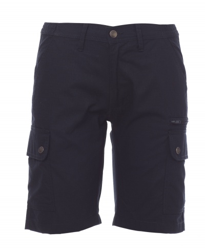 Damen-Bermudas mit seitlich dehnbarem Bund und Gürtelschlaufen, Hosenschlitz mit Metallreißverschluss und -knopf, zwei klassisch geschnittenen Vordertaschen, zwei Seitentaschen mit Patte und Druckknöpfen, einer Reißverschlusstasche links, einer Einstecktasche für den Zollstock rechts, zwei Gesäß-Leistentaschen mit Knopf und Knopfloch