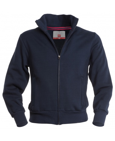 Taillierte Damen-Sweatjacke mit durchgehendem SBS-Reißverschluss und Metallschieber, anliegendem Rippstrickbund, zwei Taschen mit Reißverschluss, Ärmelbündchen, Taille und Kragen aus elastischem Rippstrick, verstärkten Nähten