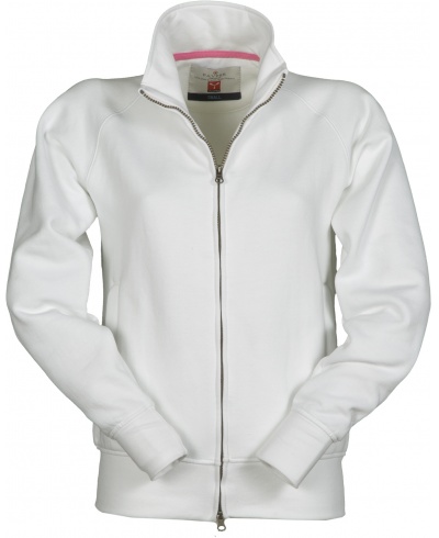 Damen-Sweatjacke mit durchgehendem, verdecktem Zwei-Wege-Reißverschluss aus Kunststoff mit Metallschieber, Raglanärmeln, zwei Taschen mit verdeckten Reißverschlüssen, elastischem Feinripp an Ärmeln und Taille, verstärkten Nähten