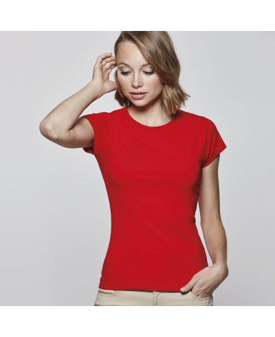 Damen T-Shirt mit eingefasstem Rundhalsausschnitt in feinem Rippstrick. Leicht zu waschen und zu trocknen. Eng geschnitten mit Seitennähten.