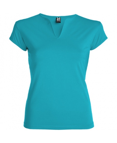 Figurbetontes Damen T-Shirt. Modisches Design. Rundhalskragen mit Einschnitt. Kurze, eingefasste Ärmel, Seitennähte.