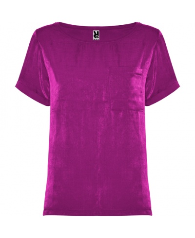 Kurzärmeliges Damen T-Shirt mit tiefem Rundhalsausschnitt. Linke Brusttasche. Modell mit verlängertem Rückenteil und Seitenschlitze. Front Gewebe Satin und hintere Baumwolle.