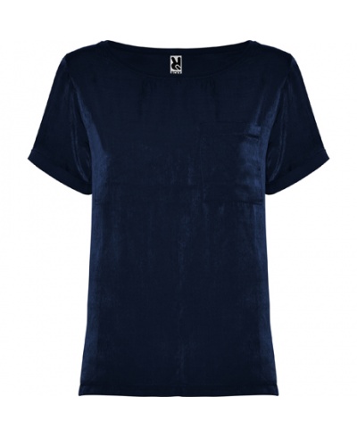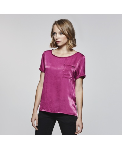 Kurzärmeliges Damen T-Shirt mit tiefem Rundhalsausschnitt. Linke Brusttasche. Modell mit verlängertem Rückenteil und Seitenschlitze. Front Gewebe Satin und hintere Baumwolle.
