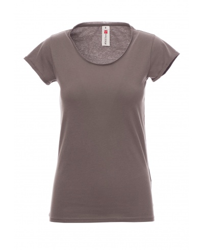 Tailliertes Damen-T-Shirt, kurzärmelig, mit tiefem, offenkantigem V-Ausschnitt, Innen-Doppelnaht an den Schultern, Ärmeln mit schmalem, offenkantigem Aufschlag, Seitennaht, Transfer-Etikett