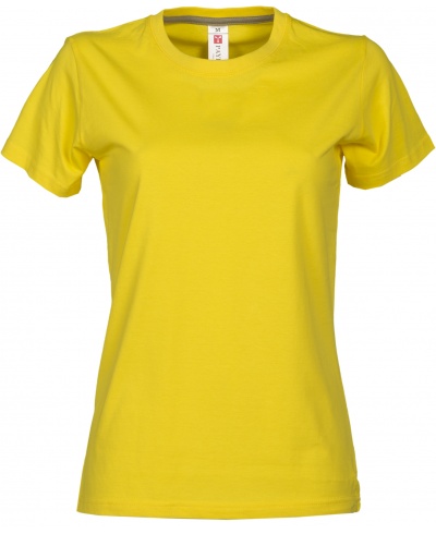 Tailliertes Damen-T-Shirt mit Rundhalsausschnitt, kurzärmelig, Feinripp-Kragen 1,5 cm aus Spandex-Mischgewebe mit Kappnaht an der Vorderseite, Verstärkungsband in Kontrastfarbe von Schulter