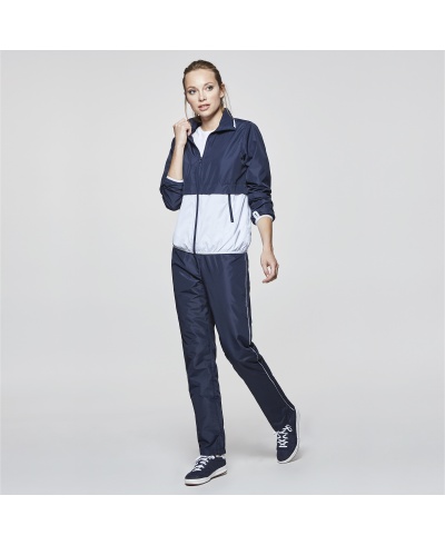 Damen Trainingsanzug. Kontrastfarbige Reißverschlüsse. Beinabschluss mit Gummizug. Netzinnenfutter. Hose mit kontrastfarbigen Seitennähten. Elastisches Bund mit Gummizug.
