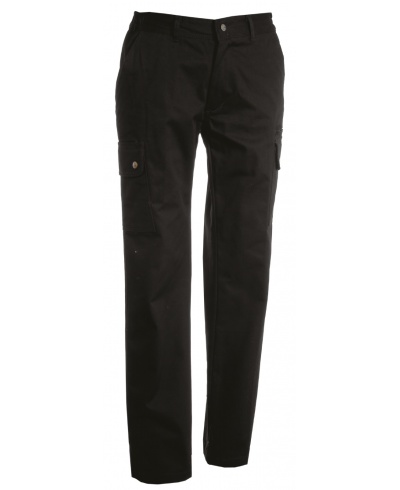 Gürtelschlaufen, Hosenschlitz mit Reißverschluss und Metallknopf, 2 klassisch geschnittenen Vordertaschen, 2 Seitentaschen mit Patte und Druckknöpfen, 1 Sicherheitstasche mit Reißverschluss links, 1 Einstecktasche für den Zollstock rechts, 2 Gesäß-Leistentaschen mit Knopf und Knopfloch