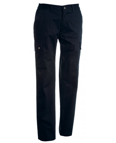 Gürtelschlaufen, Hosenschlitz mit Reißverschluss und Metallknopf, 2 klassisch geschnittenen Vordertaschen, 2 Seitentaschen mit Patte und Druckknöpfen, 1 Sicherheitstasche mit Reißverschluss links, 1 Einstecktasche für den Zollstock rechts, 2 Gesäß-Leistentaschen mit Knopf und Knopfloch