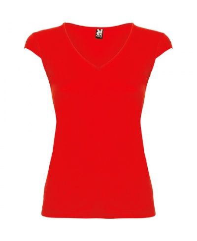 Tailliertes DamenT-Shirt mit tiefem, eingefassten V-Ausschnitt in feinem Rippstrick. Flügelärmel. Seitennähte.