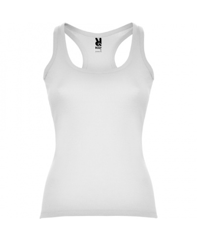 Enganliegendes Damen Tank Top. Rückenansicht im Racerback Style. Tiefer Hals- und Ärmelausschnitt. Seitennähte.