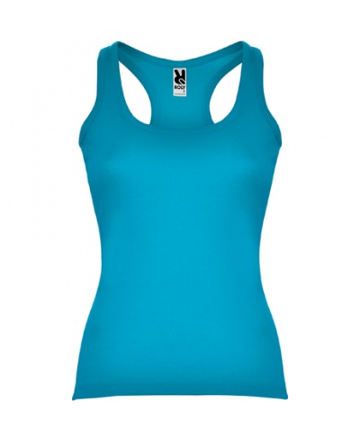 Enganliegendes Damen Tank Top. Rückenansicht im Racerback Style. Tiefer Hals- und Ärmelausschnitt. Seitennähte.