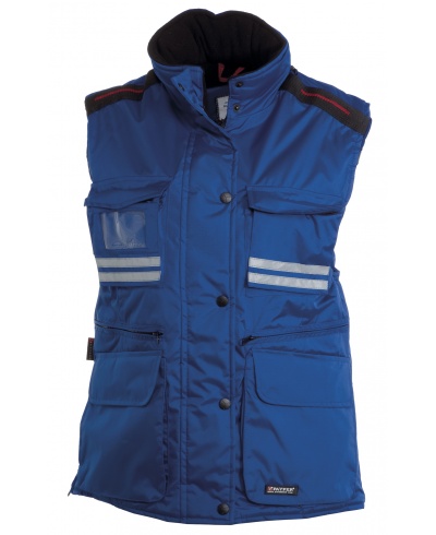 Taillierte Damen-Weste mit verdecktem 8 mm Reißverschluss aus Kunststoff mit Metallschieber und Kunststoffknöpfen, vorgeformter, abnehmbarer oder im Kragen einrollbarer Kapuze, grauen Reflexstreifen vorne und hinten, Seitenschlitz mit Ziehharmonikafalte und Reißverschluss, neun Außentaschen, davon zwei mit
