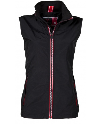 Damenweste mit elastischem Bund, Reißverschluss in Kontrastfarbe, 2 Außentaschen mit verdecktem Reißverschluss; Innenseite nicht wattiert, Netzfutter, 1 Innentasche mit Reißverschluss und Öffnung für Smartphone-Kopfhörer, Reißverschluss am Bund zum einfacheren Veredeln mit Druck und Stick