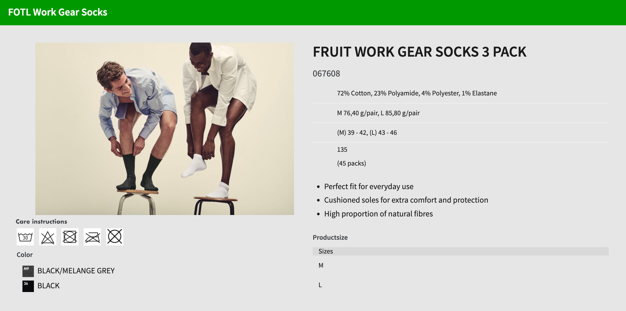 Material: 72 % Baumwolle, 23 % Polyamid, 4 % Polyester, 1 % Elastan; Gewicht: M 76,40g/Paar, L 85,80g/Paar; Zertifikate: STANDARD 100 by OEKO-TEX®; WRAP
