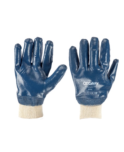 NBR-Handschuhe, komplett gefüttert, Strickbund, Baumwoll-Jersey-beschichtet; Eigenschaften: robust, sehr widerstandsfähig; Stärken: Passform, Griffigkeit, Schutz, beständig gegen Flüssigkeiten, praktisch; Einsatzbereiche: starke Beanspruchung, Metalle, scharfe und abrasive Materialien, Öl, Fett, Schmutz, Kohlenwasserstoffe, Schmiermittel