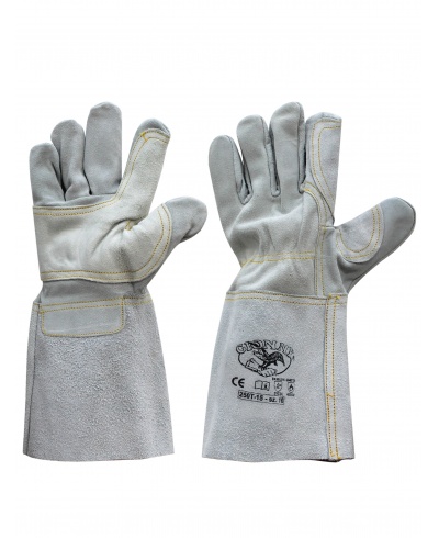 Rindspaltlederhandschuh, verstärkte Spaltlederhandfläche, Daumen und Zeigefinger, Handgelenkschutz, 14 cm Spaltledermanschette. - Eigenschaften: robust, sehr widerstandsfähig - Stärken: Griffigkeit, Schutz - Anwendungsbereiche: schwere Handhabung, geeignet für den Kontakt mit heißem, entgratetem Material