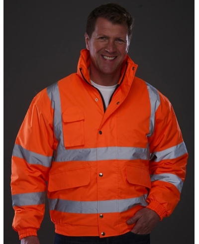 100% Polyester • Sicherheits-Bomberjacke mit Reflektorstreifen quer und längs auf Vorder- und Rückseite • Kragen mit integrierter Kapuze • Full Zip und Druckknopfblende • Innentasche • Handy- und Seitentaschen • Elastische Armbündchen und Bund • EN 471 Klasse 3.