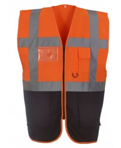 100% Polyester • Sicherheitsweste mit Reflektorstreifen quer und längs auf Vorder- und Rückseite • Schlüsselring und Sichtfenster für Namensschild auf der Vorderseite • Handytasche mit Klettverschluss, zwei Seitentaschen mit Klettverschluss • Praktischer Zip vorne • EN 471 Klasse 2.