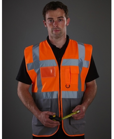 100% Polyester • Sicherheitsweste mit Reflektorstreifen quer und längs auf Vorder- und Rückseite • Schlüsselring und Sichtfenster für Namensschild auf der Vorderseite • Handytasche mit Klettverschluss, zwei Seitentaschen mit Klettverschluss • Praktischer Zip vorne • EN 471 Klasse 2.
