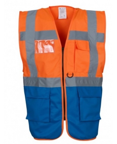 100% Polyester • Sicherheitsweste mit Reflektorstreifen quer und längs auf Vorder- und Rückseite • Schlüsselring und Sichtfenster für Namensschild auf der Vorderseite • Handytasche mit Klettverschluss, zwei Seitentaschen mit Klettverschluss • Praktischer Zip vorne • EN 471 Klasse 2.