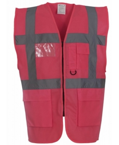 100% Polyester • Sicherheitsweste mit Reflektorstreifen quer und längs auf Vorder- und Rückseite • Schlüsselring und Sichtfenster für Namensschild auf der Vorderseite • Handytasche mit Klettverschluss, zwei Seitentaschen mit Klettverschluss • Praktischer Zip vorne • EN 471 Klasse 2.